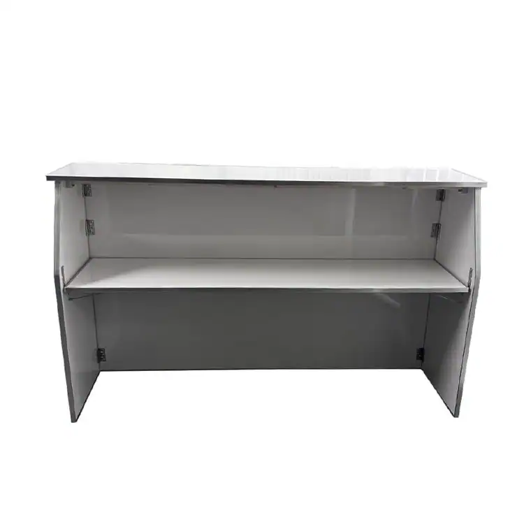 This 6 ft. portable bar features a clean white laminate finish and includes a 20″ deep server prep shelf. When fully assembled, it stands 43″ high, and it conveniently folds down for easy transport and storage.